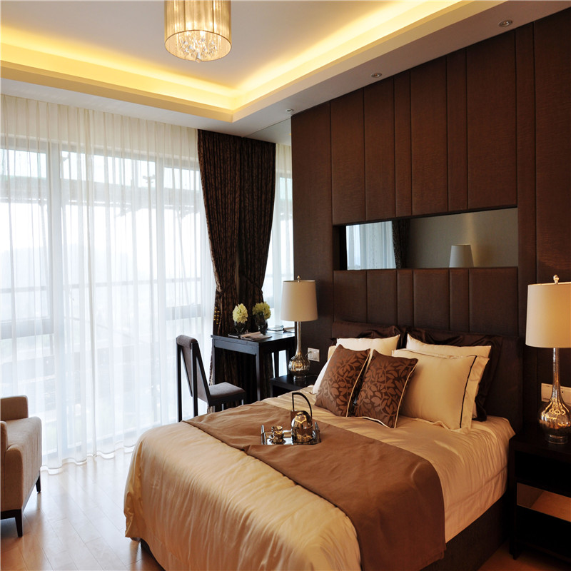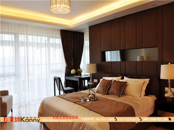 软包及床品创造出一个安静优雅的环境,镀鉻金属的装饰更能突出用品的品味。
